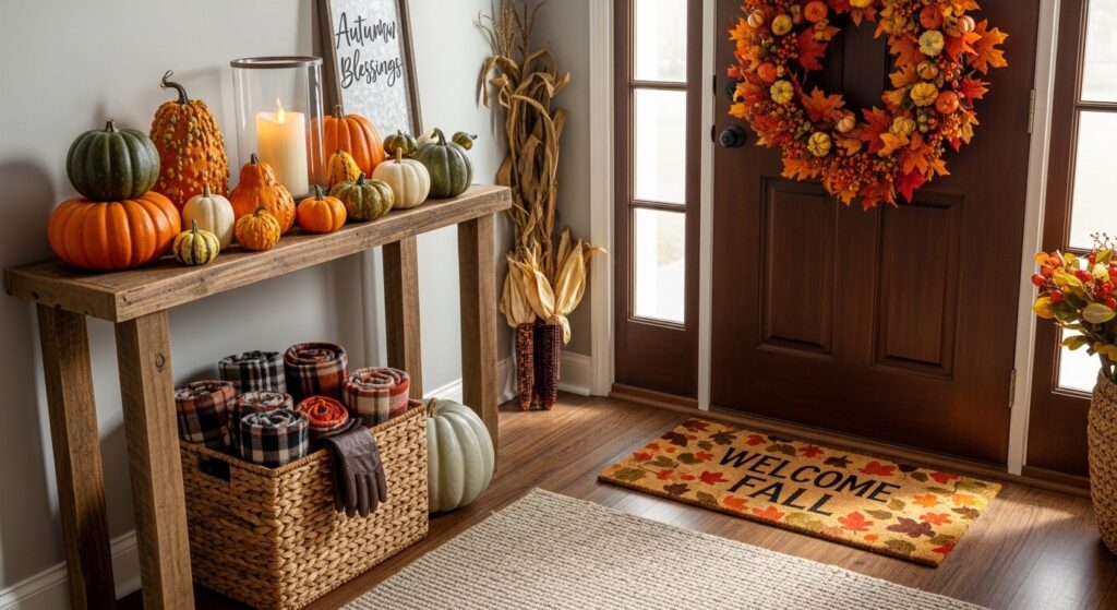 Entryways establish seasonal tone immediately upon entering, making them essential spaces for impactful autumn decorating. Style console tables with pumpkin arrangements, candles, and fall foliage. Hang wreaths on doors nearby. Add seasonal doormats with harvest greetings. Include practical elements like boot trays, hooks for coats, or baskets for scarves and gloves as weather cools. The functional beauty combination makes entries both welcoming and prepared for fall’s changing needs. Layer heights through tall branches, medium pumpkins, and small decorative objects for dimensional interest. Include a mirror for final appearance checks before leaving.