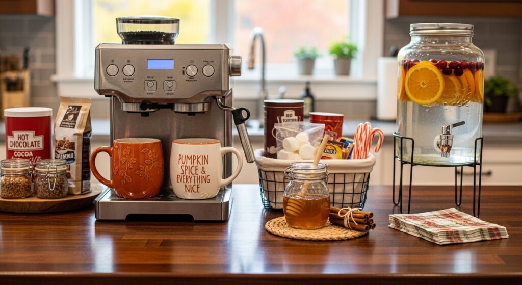 Offer variety to accommodate different preferences—caffeinated and herbal teas, regular and decaf coffee, classic and specialty hot chocolate options. The station becomes a natural gathering point that facilitates connection and conversation. Include a small tray for used mugs to maintain organization. Consider adding a seasonal beverage menu with family favorites or new recipes to try. This practical decorating idea combines beauty and function, creating thoughtful, hospitable spaces that make comfort accessible while honoring fall’s beverage traditions that warm both body and spirit, transforming everyday drink preparation into small seasonal rituals worth savoring.