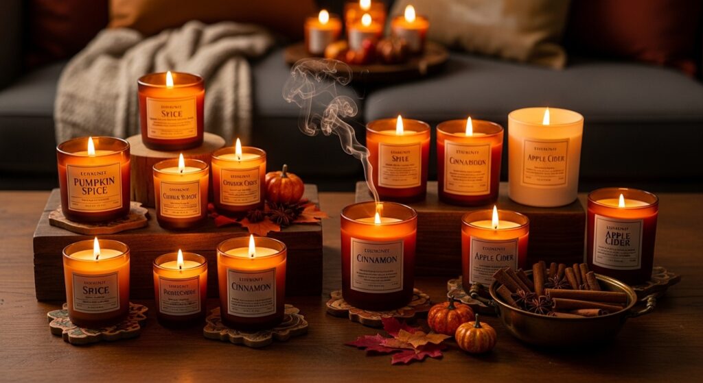 Scented candles create multi-sensory autumn experiences by adding warm fragrances alongside visual ambiance. Choose classic fall scents—pumpkin spice, apple cider, cinnamon, vanilla, woodsy cedar, or spiced cranberry. Display candles at varying heights in complementary holders made from brass, copper, wood, or glass. Light during evening hours to create flickering illumination and aromatic warmth simultaneously. The combined sensory experience makes spaces feel more complete and immersive, engaging smell and sight to create truly cozy environments. Quality candles transform ordinary rooms into seasonal sanctuaries through fragrance alone.