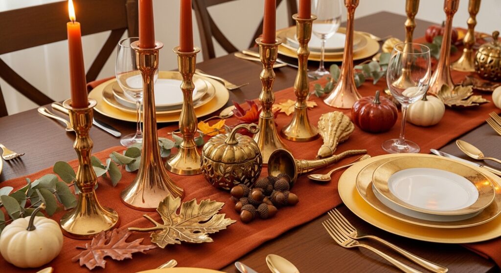 Warm metallics—copper, brass, bronze, and gold—add luxurious touches that complement autumn’s color palette while reflecting light beautifully. Introduce metallic elements through candlesticks, picture frames, decorative bowls, serving pieces, or spray-painted pumpkins and pinecones. The reflective surfaces catch and bounce candlelight and lamplight, making rooms feel brighter and more dynamic. Metallics elevate simple natural elements, transforming casual arrangements into sophisticated displays. The warm tones harmonize with wood, leather, and fall colors while adding sparkle and refinement that makes spaces feel special and intentionally designed.