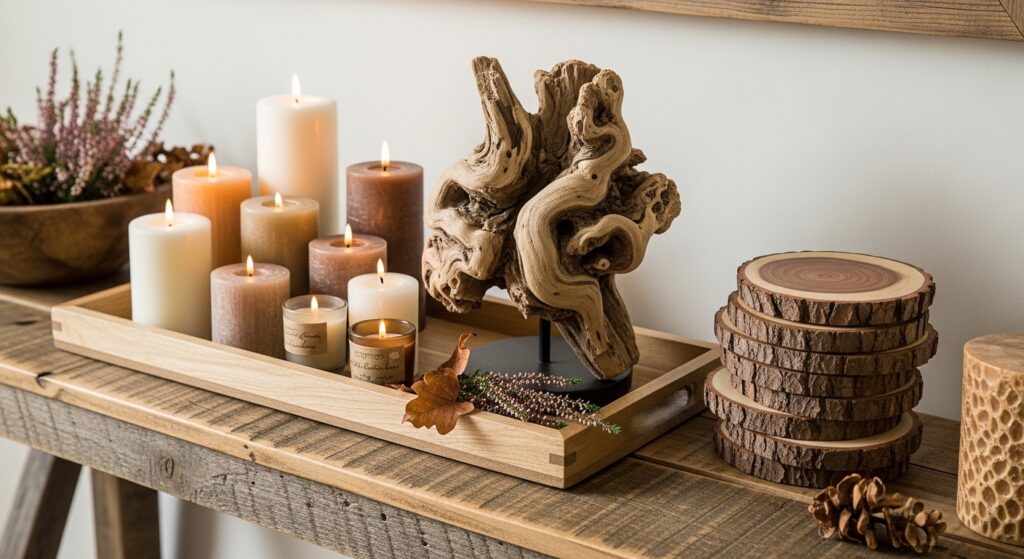 Natural wood adds organic warmth and earthy texture that grounds autumn decorating in authentic materials. Display wooden bowls filled with acorns or pinecones, use wood slices as chargers or trivets, incorporate driftwood as sculptural elements, or add wood bead garlands. The varied wood tones from pale pine to deep walnut contribute earthy autumn color while grain patterns provide visual interest. Wood elements work across all design styles while offering sustainable, long-lasting decorative options. The natural material connects indoor spaces to forests and harvest abundance, honoring fall’s agricultural heritage and natural beauty.
