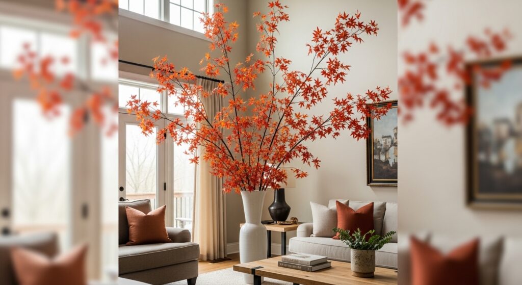 Branches laden with colorful autumn leaves bring nature’s magnificent show indoors in dramatic vertical arrangements. Gather branches during walks or purchase from florists, selecting varieties with vibrant fall colors—maple, oak, or other deciduous trees. Display in tall vases or vintage containers where height creates impact and draws eyes upward. The organic shapes and natural color variations feel authentic and effortless. Foliage arrangements work beautifully in entryways, dining rooms, or any space benefiting from vertical interest and seasonal color. The substantial presence makes single arrangements sufficient focal points.