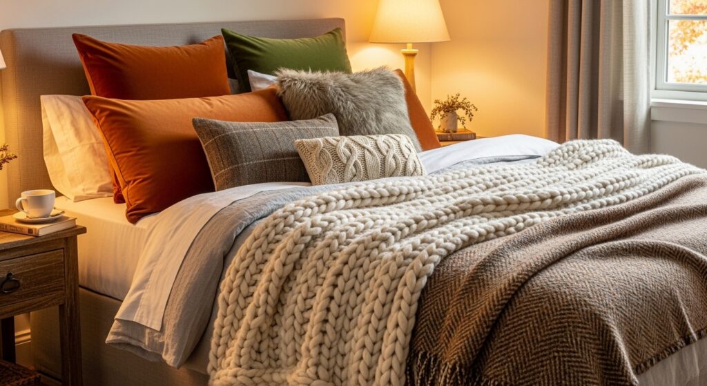 Layering various textures creates the tactile richness that defines cozy autumn interiors. Combine chunky knit throws with smooth velvet pillows, soft flannel with nubby linen, and plush faux fur with woven cotton. The varied surfaces engage touch and sight simultaneously, making spaces feel intentionally designed and luxuriously comfortable. Focus textile layering in areas where you spend time—sofas, beds, reading chairs—so the comfort becomes part of daily experience. The substantial textile presence adds essential warmth as temperatures drop while creating visual depth through varied materials and weaves.