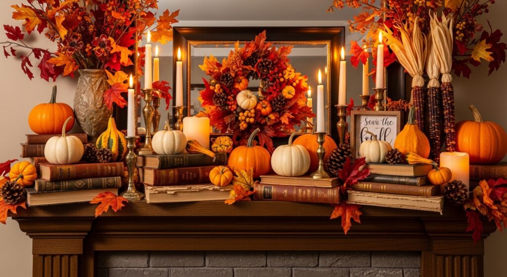 Mantels provide premium display space for creating impressive seasonal arrangements that anchor rooms and establish autumn tones. Build layered displays with varying heights—tall candlesticks or branches at the back, medium pumpkins and decorative objects in the middle, smaller elements like acorns or mini gourds at the front. Create visual balance through asymmetrical arrangement rather than perfect symmetry for organic, collected aesthetics. Include candles for warm glowing light that enhances cozy evening atmospheres. The mantel becomes your room’s seasonal statement piece, drawing attention and setting the decorative tone for surrounding spaces.
