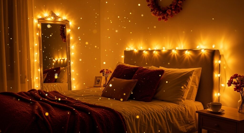 String lights create magical twinkling effects that enhance autumn’s cozy atmosphere with minimal effort or expense. Drape warm white or amber-toned fairy lights along headboards, around mirrors, across mantels, or along open shelving. Battery-operated options eliminate cord concerns while allowing flexible placement anywhere. The gentle twinkling provides ambient lighting that feels warmer and more inviting than overhead fixtures. Choose warm-toned bulbs rather than cool white for authentic autumn warmth. Consider timer functions for automatic evening illumination. The affordable addition delivers outsized atmospheric impact, transforming ordinary rooms into glowing sanctuaries.