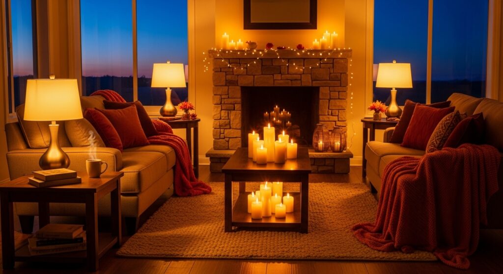 Emphasize ambient and accent lighting over harsh task lighting during evening hours when coziness matters most. The soft illumination creates pools of light rather than uniform brightness, adding depth and intimacy. Consider flameless LED candles if fire safety concerns prevent using real flames—modern versions flicker convincingly while eliminating risks. String lights draped along shelves or around windows add whimsical twinkling effects. This lighting strategy makes every autumn evening feel special and magical, transforming ordinary rooms into glowing havens that beckon you to slow down, relax, and savor fall’s gentle, contemplative pace and shorter days’ invitation to gather indoors.