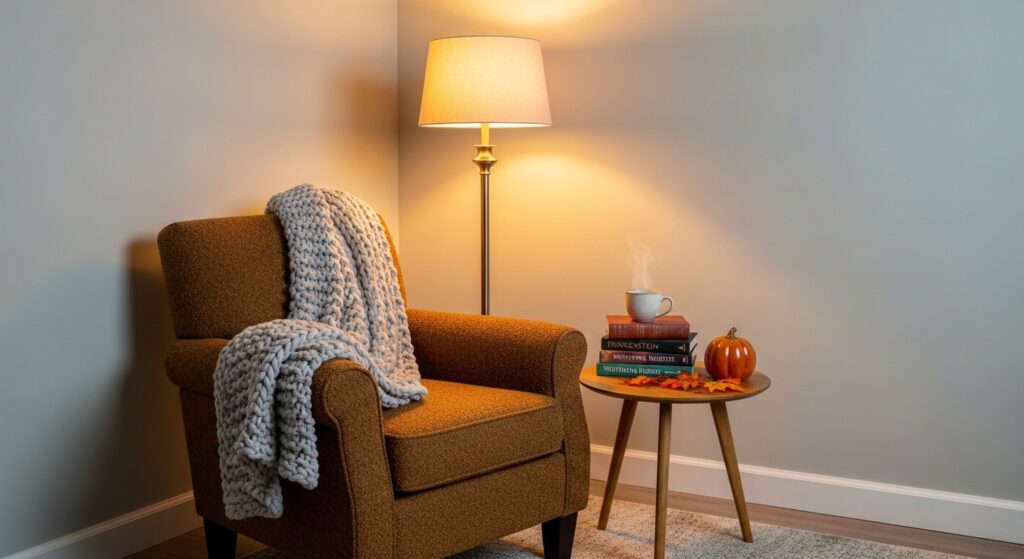 Enhance nooks with seasonal touches like fall foliage in a small vase, a scented candle, or slippers stored underneath for complete comfort. Position near natural light if possible for daytime reading while the lamp provides evening illumination. The reading retreat becomes your favorite fall destination, making the season’s quieter pleasures accessible and inviting. Add a soft rug underfoot for warmth and texture. This purposeful space creation acknowledges autumn’s invitation to slow down and embrace contemplative activities that nourish rather than merely distract, creating rooms that support the kind of restorative rest and reflection that makes fall such a treasured, soul-restoring season.