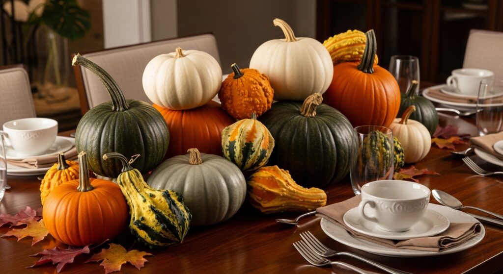 Pumpkins and gourds instantly communicate autumn with their distinctive shapes and harvest associations. Create displays using varied sizes, colors, and varieties—traditional orange alongside white, green, blue-gray, and warty heirloom types. Cluster on dining tables, coffee tables, entryway consoles, or porch steps in odd-numbered groupings for visual appeal. The natural variations in pumpkin forms and coloring create organic interest without requiring perfect arrangement. Real pumpkins offer authenticity while quality faux versions provide multi-year reusability. Mix smooth pumpkins with bumpy or striped varieties for textural diversity that adds visual interest.