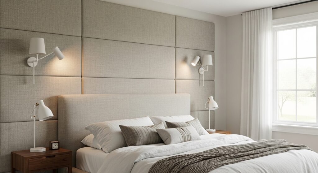 Fabric accent walls add softness and comfort. Upholstered panels behind beds improve acoustics and create a luxurious feel. This idea is perfect for bedrooms, making them feel cozy, warm, and inviting.