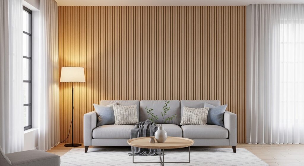 Wooden slat walls add warmth and texture while maintaining a clean, modern look. They’re ideal for minimalist or Scandinavian interiors and work well behind sofas or beds. The natural wood tones create a cozy, inviting atmosphere without requiring heavy decoration.
