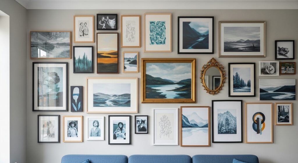 A gallery wall doubles as an accent wall while showcasing your personality. Mix photos, art prints, and quotes using matching frames for balance. This idea is budget-friendly and allows you to update the look easily by swapping artwork over time.