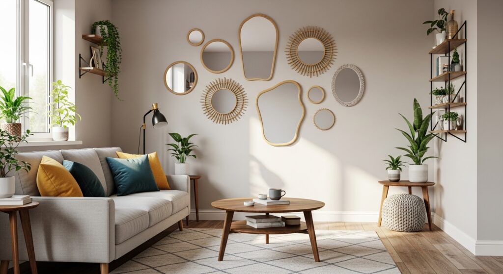 Mirror accent walls enhance light and make rooms appear larger. This is an excellent solution for small spaces or dark rooms. Decorative mirrors add style while improving brightness and openness.