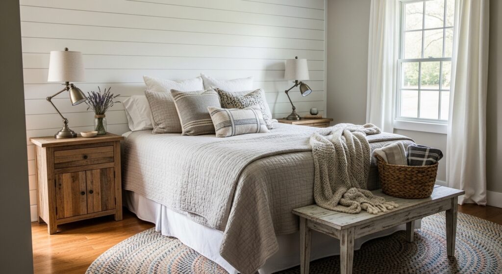 Shiplap accent walls bring a relaxed farmhouse vibe to any room. Painted white or soft neutrals, they make spaces feel bright and welcoming. This idea works especially well in bedrooms and living rooms for a calm, clean look.