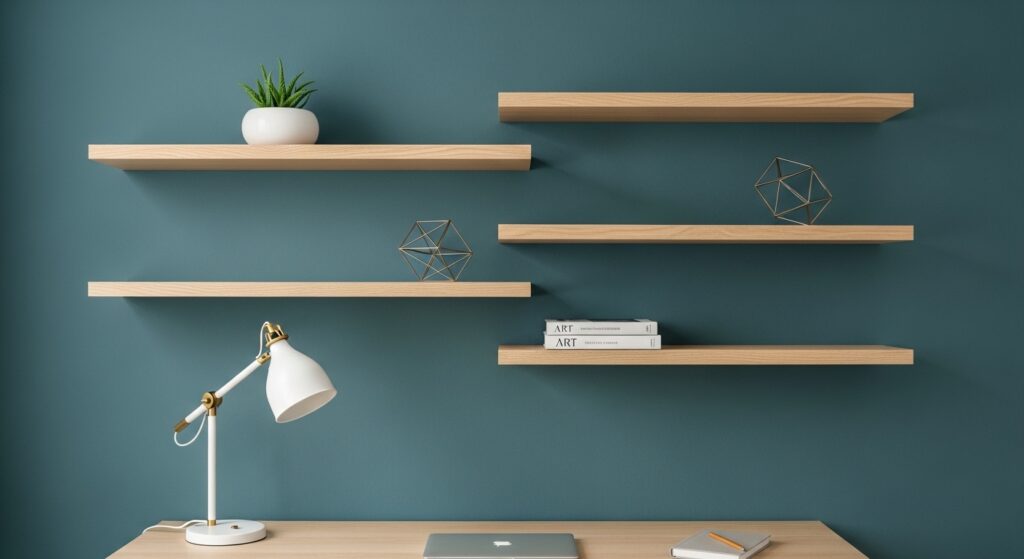 Floating shelves make accent walls both stylish and functional. Use them to display plants, books, or décor items. This idea works well in small rooms, helping you add character without sacrificing valuable floor space.