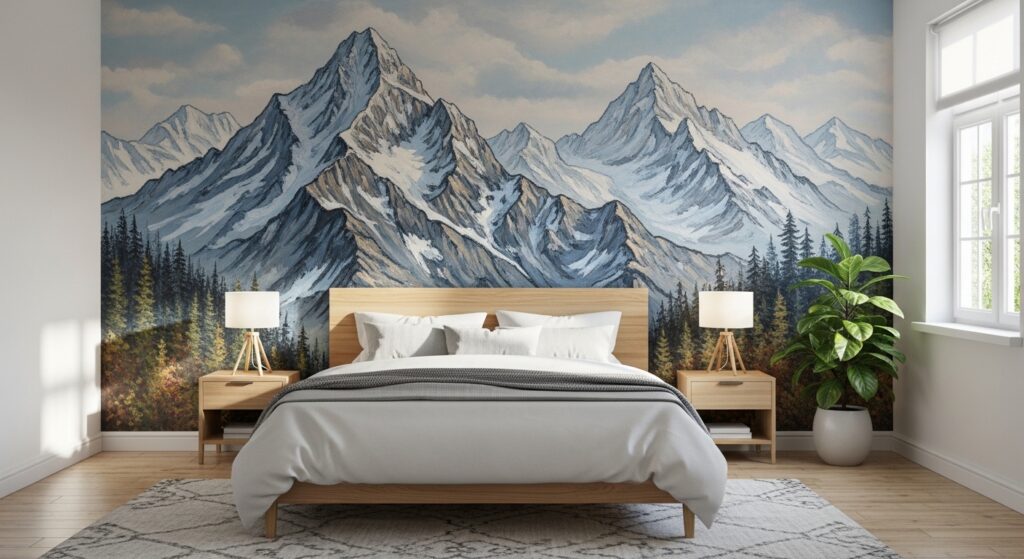 Murals turn your accent wall into a piece of art. Nature-inspired designs like mountains, forests, or skies create a peaceful vibe. This idea is great for bedrooms or kids’ rooms, adding creativity and storytelling to the space.