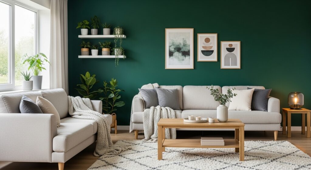 Using plants as an accent wall brings life and freshness indoors. Vertical plant displays or hanging pots create a natural focal point. This idea improves the room’s mood and works beautifully in bright living spaces.