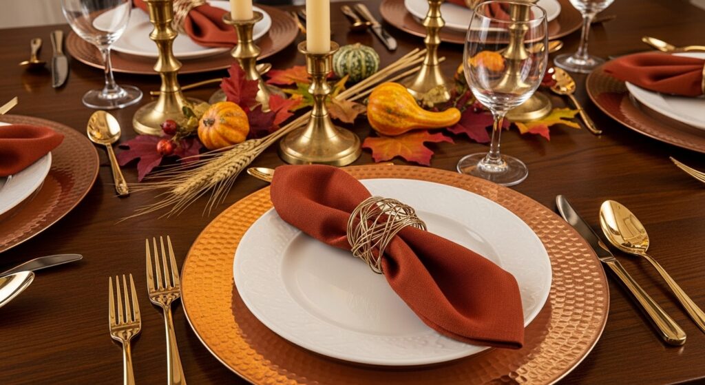 Warm metallic accents add sophisticated shimmer and light-reflecting beauty that elevates Thanksgiving tables from casual to special. Use copper chargers under dinner plates that catch and reflect candlelight beautifully. Choose gold or brass flatware that feels more celebratory than everyday stainless steel. Add brass candlesticks in varying heights for warm metallic glow and elegant vertical interest throughout your table setting.