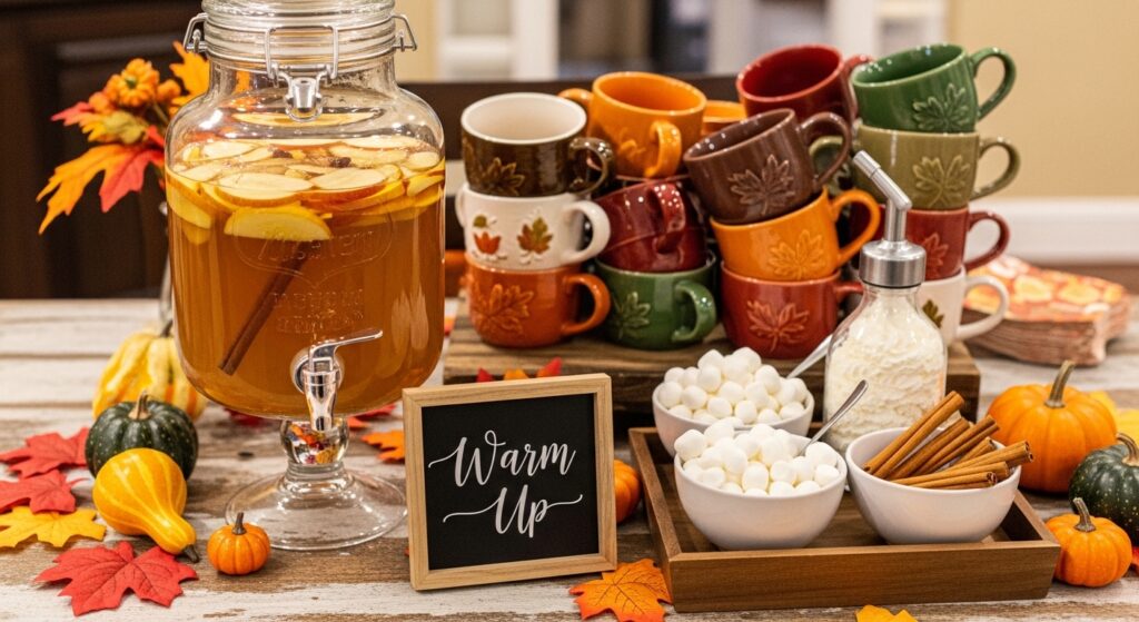 A dedicated beverage station provides hospitality and creates a festive focal point that encourages mingling. Set up a large glass dispenser with hot spiced apple cider that guests can serve themselves throughout the day. Create a hot chocolate bar with quality cocoa, marshmallows, whipped cream, and fall spices. Display an assortment of festive mugs in fall colors and patterns adding visual charm and personal choice for each guest.