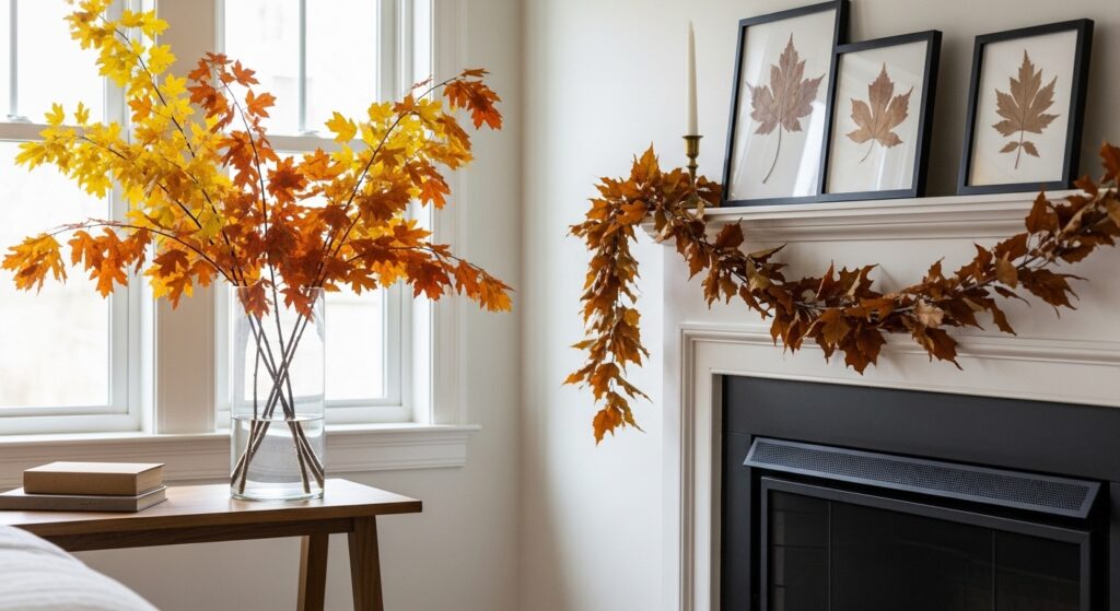 Fall foliage brings nature’s spectacular autumn show directly into your home with minimal cost and maximum impact. Gather branches with colorful leaves in reds, oranges, and golds, displaying them in tall vases throughout your space. String together preserved leaves to create garlands for mantels, doorways, or stair railings. Press particularly beautiful individual leaves and frame them as instant seasonal artwork with authentic natural beauty.