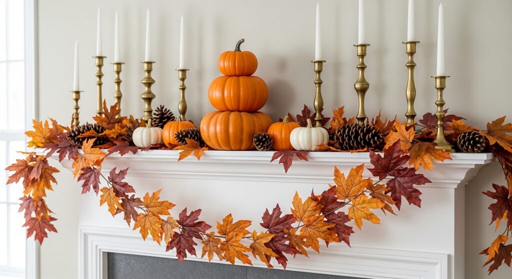 Your mantel provides prime space for creating a stunning Thanksgiving focal point that anchors your entire room. Drape a full garland of fall leaves mixed with wheat stalks and berries across the mantel’s length. Arrange pumpkins and gourds in graduating sizes along the mantel, mixing colors for visual interest. Nestle brass or wooden candlesticks of varying heights among the pumpkins for vertical dimension and warm light throughout your gathering.