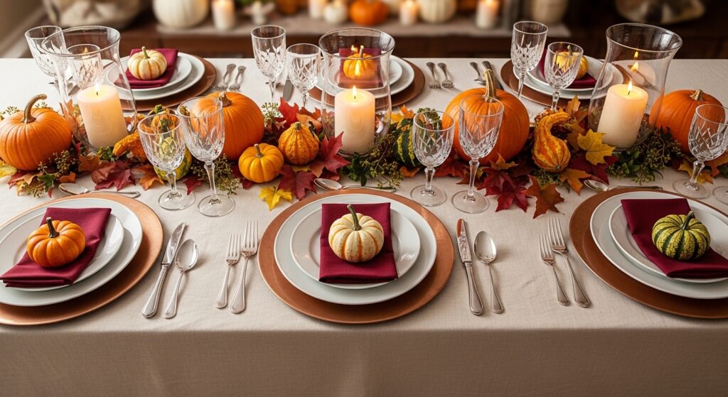 A thoughtfully set Thanksgiving table sets the tone for your entire celebration and shows genuine care for guests. Layer a linen tablecloth in cream or warm beige as your foundation, then use simple white dishes that let food shine. Add copper or brass chargers beneath plates for warmth and harvest elegance. Place cloth napkins in fall colors at each setting, perhaps tied with twine and fresh herb sprigs for natural beauty.