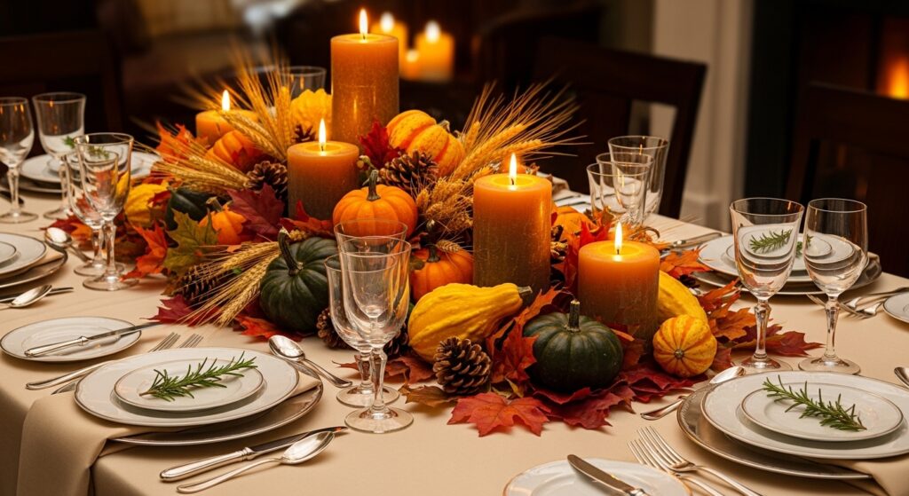 An abundant harvest centerpiece captures Thanksgiving’s essence of gratitude and plenty in one beautiful focal point. Arrange mini pumpkins and gourds in varying colors down your table’s center, tucking wheat stalks and colorful fall leaves between them. Add pinecones, acorns, and other foraged natural elements for woodland charm. Nestle amber or cream pillar candles throughout the arrangement for warm, flickering light during your feast. This overflowing display celebrates the season’s generosity and creates a visual feast alongside your meal.