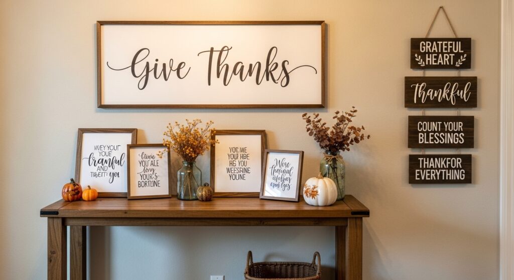 Visible gratitude messages keep Thanksgiving’s true meaning central throughout your celebration. Display a chalkboard or framed print with “Give Thanks” or “Grateful, Thankful, Blessed” in beautiful lettering near your entry. Frame inspirational quotes about gratitude, family, or abundance in simple frames distributed throughout gathering spaces. Include small wooden signs with thankful phrases on mantels or shelves where guests naturally look and pause.