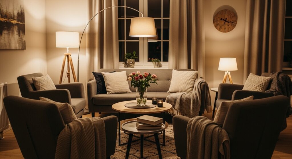 This intimate arrangement makes people feel psychologically closer and encourages genuine connection beyond small talk. The close grouping ensures your living room becomes a natural gathering spot before and after dinner. Multiple conversation areas prevent one overwhelming group, allowing various discussions and different comfort levels. The arrangement works especially well for mixed-age gatherings, creating spaces for both lively conversation and quieter interactions throughout the day.