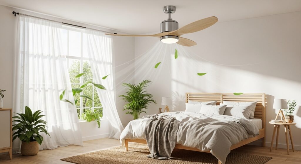 Ceiling fans significantly reduce air conditioning needs through simple air circulation. Moving air makes rooms feel several degrees cooler without changing actual temperature. This allows higher thermostat settings in summer, dramatically reducing cooling energy consumption. Modern energy-efficient fans with DC motors use minimal electricity while providing maximum airflow. Ceiling fans also improve comfort in winter by distributing warm air that rises, improving heating efficiency year-round.
