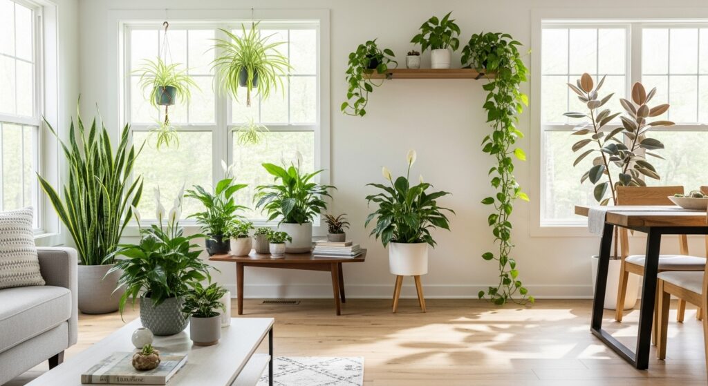 Certain houseplants actively remove toxins from indoor air while producing oxygen continuously. Snake plants filter formaldehyde and benzene while requiring minimal care and tolerating low light. Spider plants remove carbon monoxide and xylene effectively while producing oxygen even at night. Peace lilies filter ammonia, formaldehyde, and trichloroethylene while adding elegant white blooms. Pothos removes formaldehyde and purifies air while thriving with minimal attention. Rubber plants tackle formaldehyde while adding dramatic foliage and height.