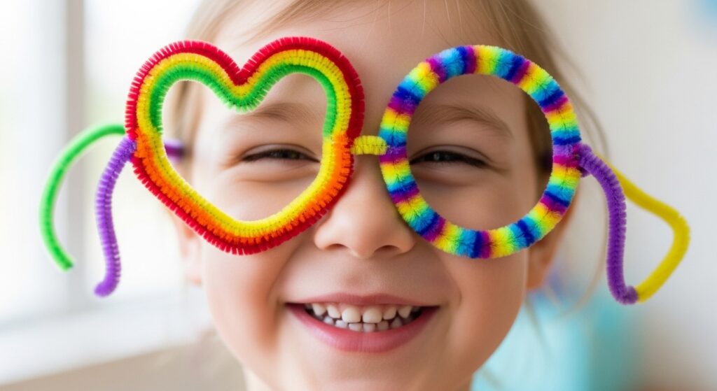 Fashion playful eyeglasses by shaping pipe cleaners into frame circles or fun shapes like hearts or stars, then creating temple pieces that hook over ears. Kids love creating and wearing these pretend glasses in various colors and styles. They’re perfect for photo booth props, dramatic play, or just silly fun that encourages creativity and imaginative role-playing activities.