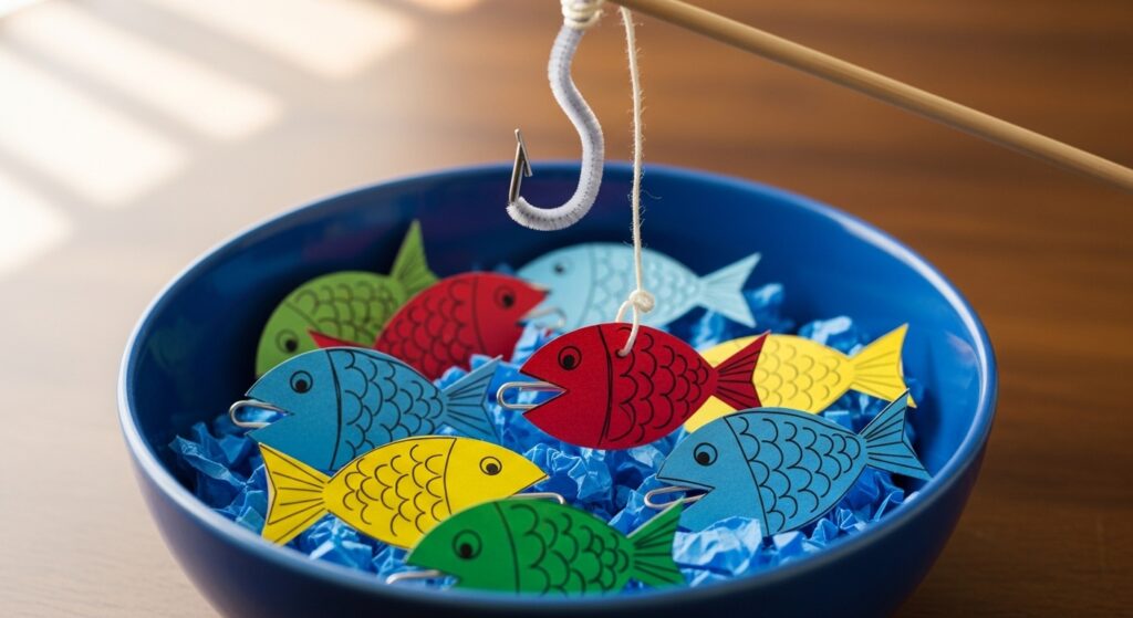 Create a magnetic fishing game by shaping one pipe cleaner into a hook attached to a stick, then making fish from paper or felt with paperclips for mouths. Kids can “catch” fish from a blue bowl “pond.” This develops hand-eye coordination, counting skills, and provides screen-free entertainment for rainy days or quiet time at home or in classrooms.
