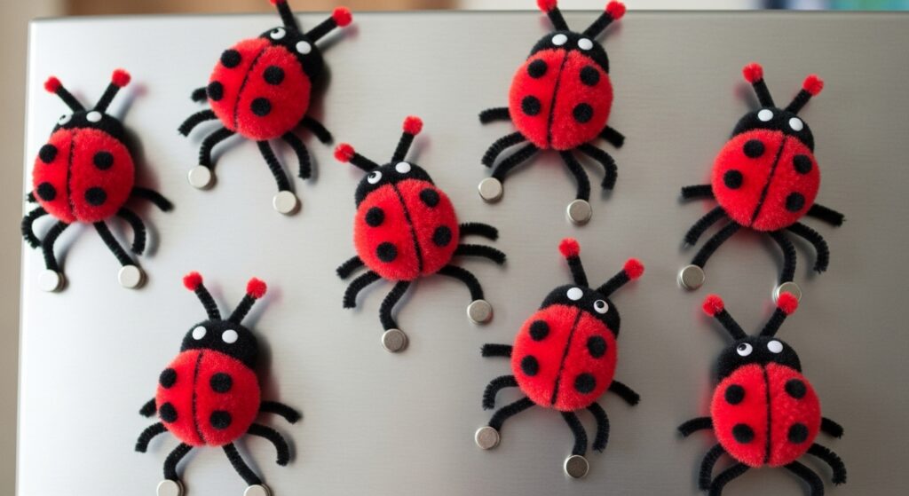 Create ladybugs using red pom-poms as bodies, adding black pipe cleaner legs (three on each side) and black dots with markers. Glue a small magnet on the bottom to display artwork on refrigerators or magnetic boards. These adorable insects brighten up kitchens, make sweet gifts, and teach children about beneficial garden insects through creative crafting activities.