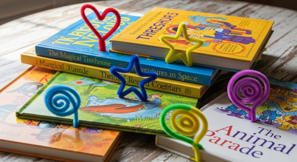 Shape pipe cleaners into simple designs—hearts, stars, or spirals—creating unique bookmarks that clip onto page edges. These won’t damage book pages and add whimsy to reading time. Make them in school colors, favorite character themes, or seasonal designs. They’re perfect gifts for young readers, teacher appreciation presents, or literacy program rewards that encourage reading habits.