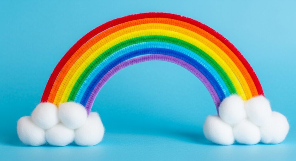 Create a rainbow by bending seven different colored pipe cleaners (red, orange, yellow, green, blue, indigo, violet) into arches, stacking them nested together. Attach cotton balls as clouds at each end. This classic craft teaches color order, creates cheerful room décor, and can be sized from tiny magnets to large wall hangings depending on pipe cleaner lengths used.