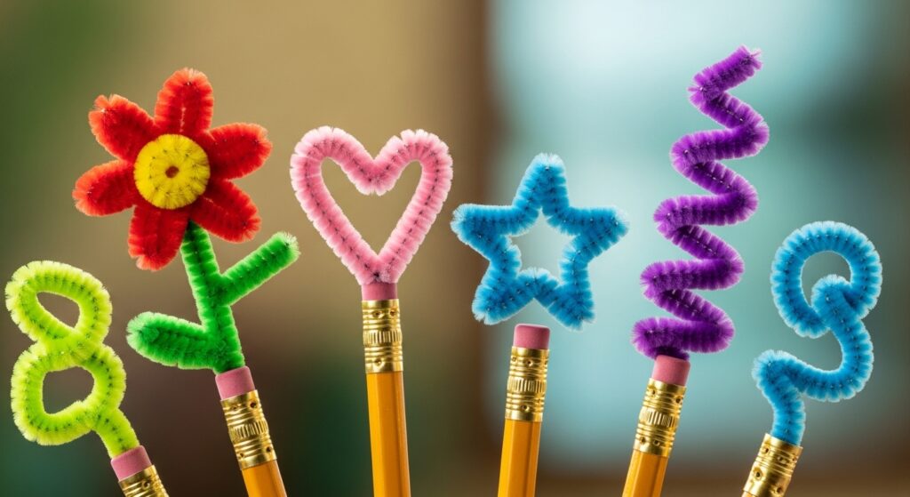 Wrap pipe cleaners around pencil tops to create decorative toppers shaped like flowers, stars, hearts, or spirals. These make homework more fun, help kids identify their own pencils, and create personalized school supplies. They’re perfect for teacher gifts, back-to-school preparation, or party favors that are both functional and decorative for students of all ages.