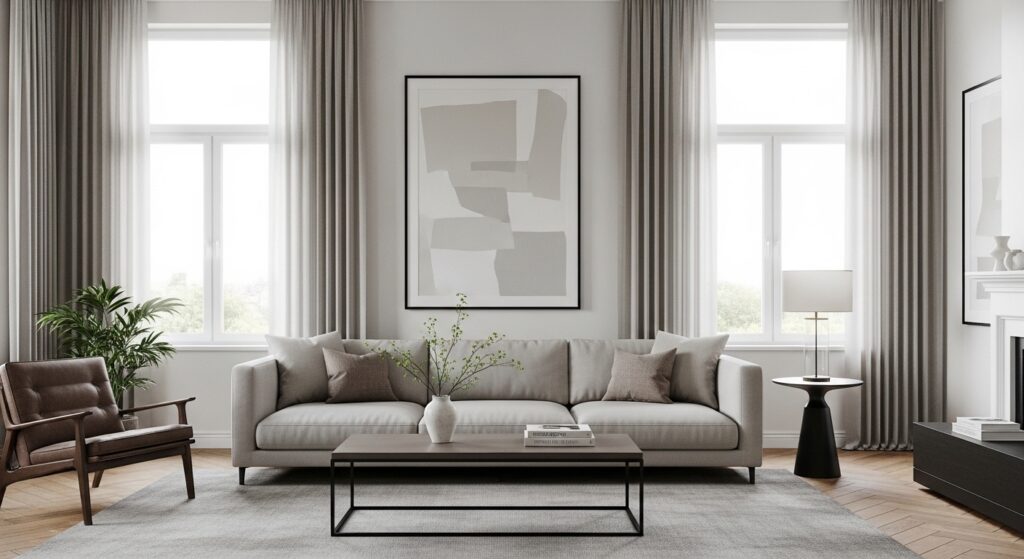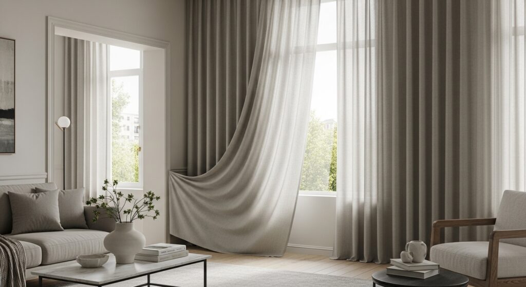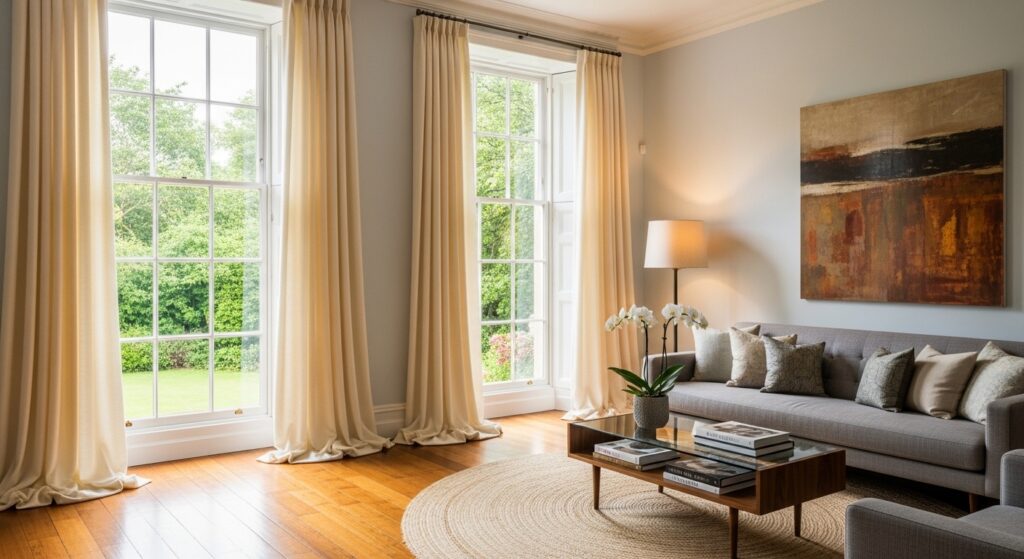 Long curtains make the room appear taller and more refined. Soft fabrics like linen or velvet add movement and warmth while framing the windows beautifully.
