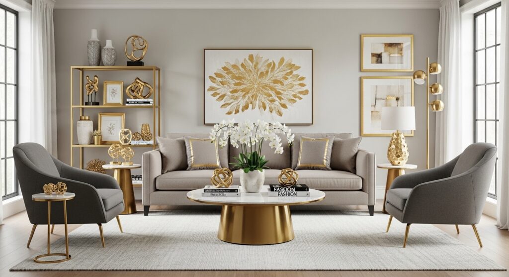 Metallic accents such as gold or brass add subtle luxury to a living room. These small touches reflect light and enhance the elegance of the space without overpowering the design.