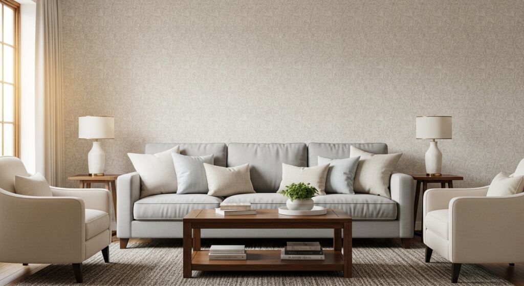 Wallpaper with a soft pattern adds visual interest while maintaining a refined style. Neutral tones ensure the design remains elegant and balanced.