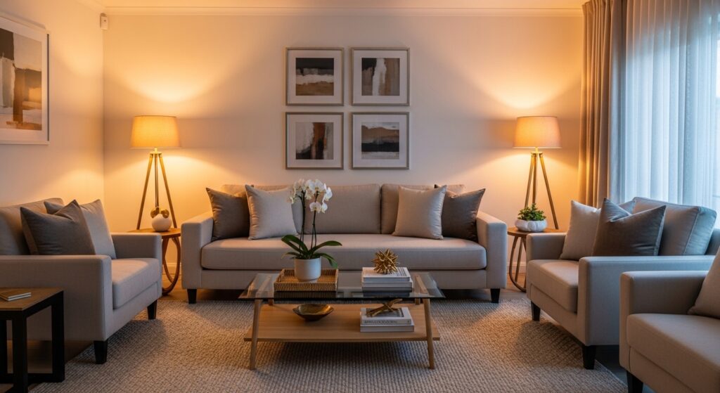 Symmetry creates harmony in interior design. Matching lamps, chairs, or decor pieces make the living room feel organized, elegant, and visually pleasing.