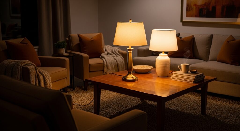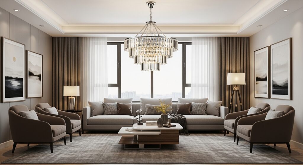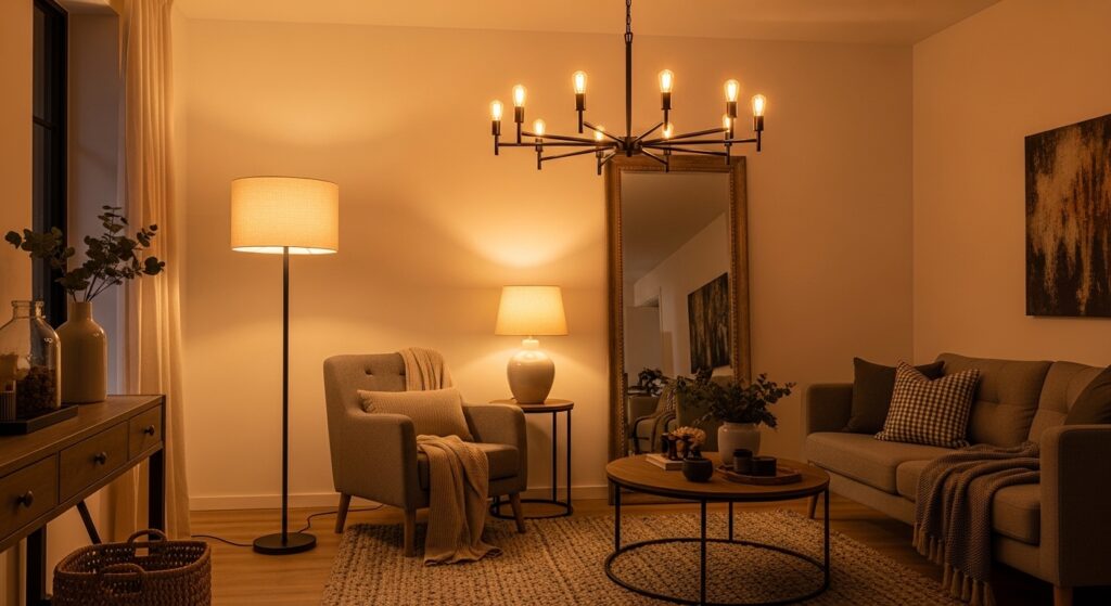 Using multiple lighting sources creates depth and warmth. Combining ceiling lights with floor lamps and table lamps makes the room feel cozy, stylish, and balanced.