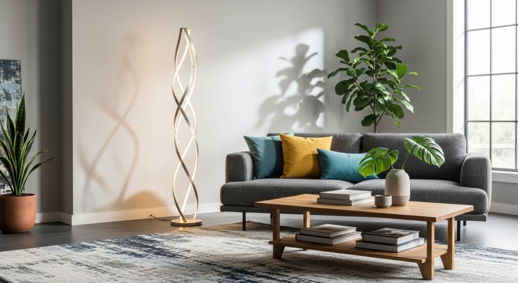 A uniquely designed floor lamp adds both lighting and artistic style. It can serve as a decorative statement piece while enhancing the room’s ambiance.