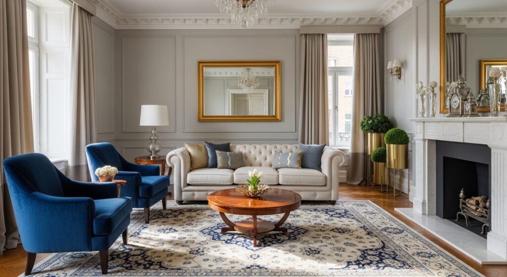 A large area rug helps anchor the furniture and adds softness underfoot. Neutral or lightly patterned rugs maintain the elegant atmosphere while bringing comfort to the space.