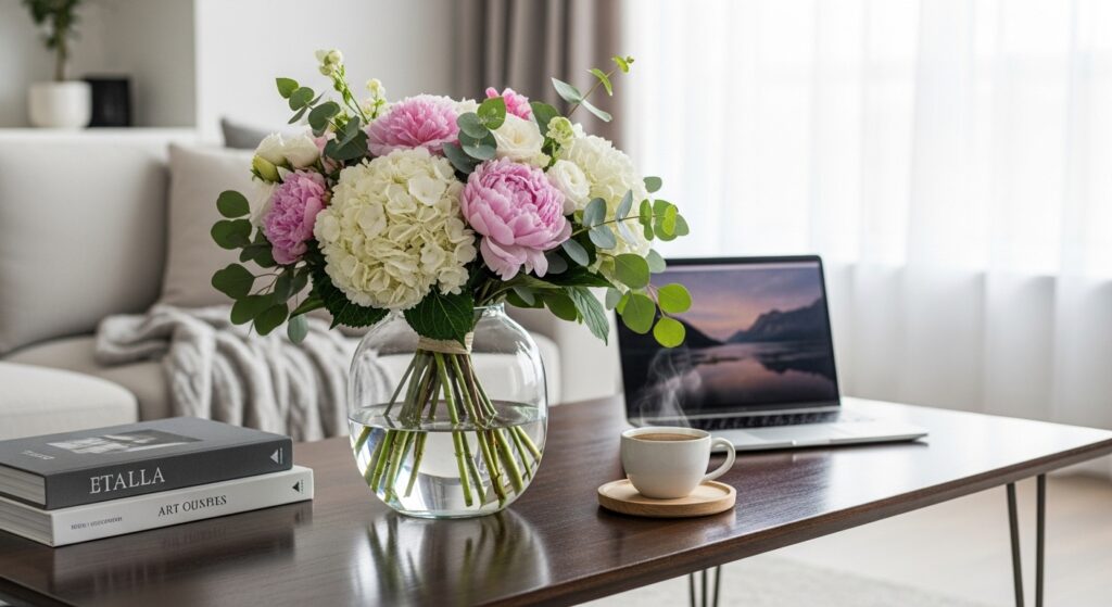 Fresh flowers bring life, color, and beauty to the living room. Even a simple floral arrangement can make the space feel more welcoming and elegant.