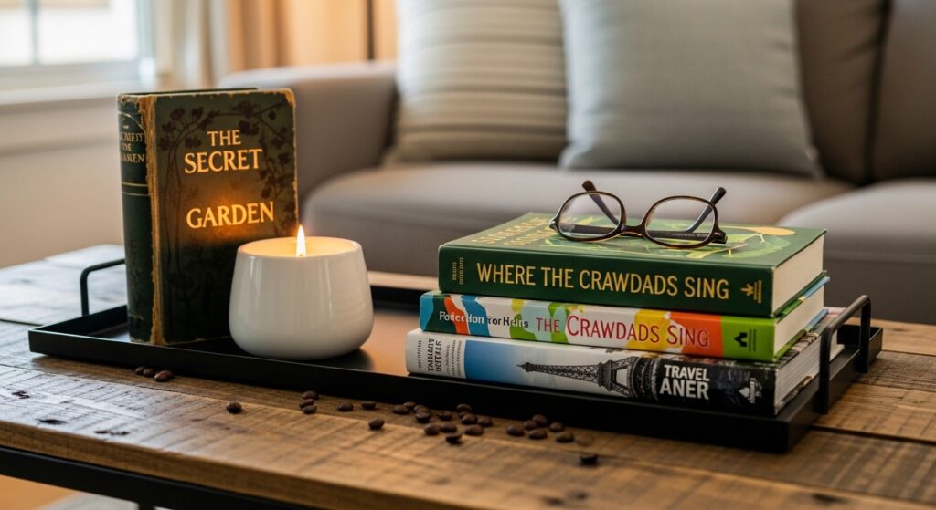 Decorative trays help organize small items while adding a stylish focal point to the coffee table.