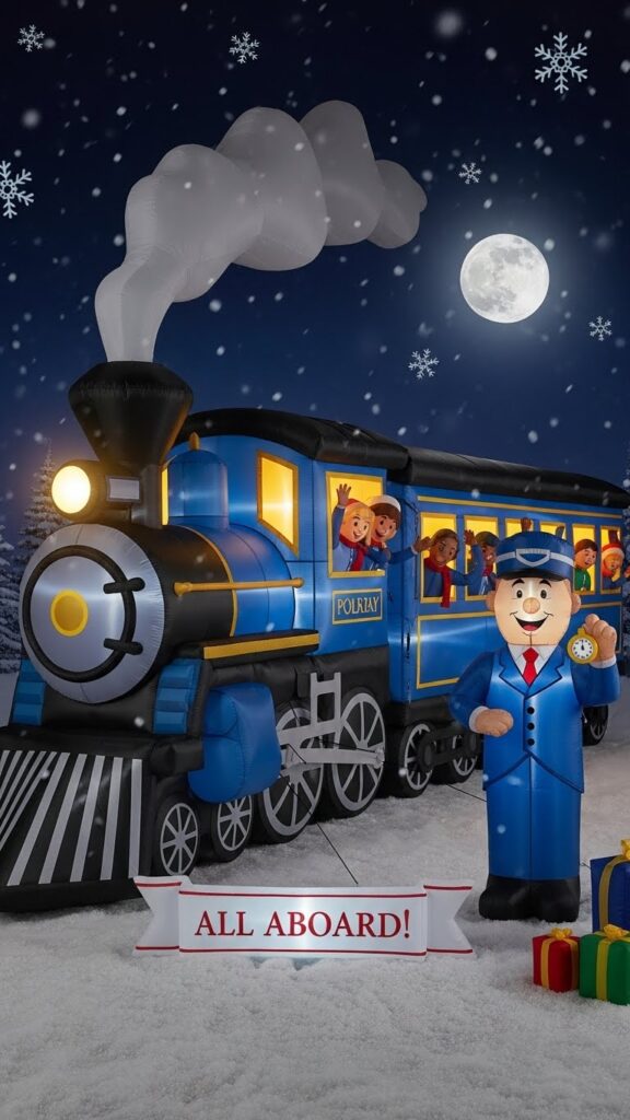 The Polar Express theme carries particular emotional weight for millennial parents who grew up with the story and now share it with their own children. Position these meaningful inflatables prominently where their detailed design can be appreciated, perhaps near your home where the golden window glow enhances your holiday lighting scheme. The train design naturally suggests movement and journey, making it effective positioned along property lines or driveways. Pair Polar Express inflatables with bell decorations, hot cocoa themes, or signs pointing to the North Pole to create immersive displays that transport viewers into the story’s magical world.