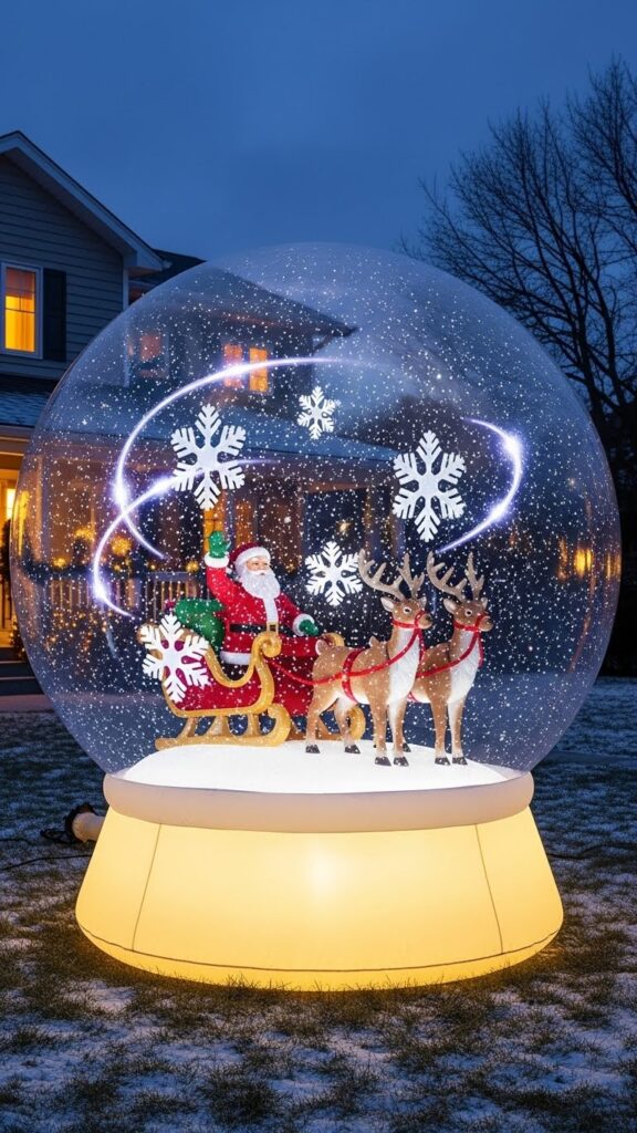 Snow globe inflatables capture the enchantment of those beloved desk decorations in spectacular oversized form. These magical pieces feature clear inflatable domes containing festive scenes—Santa preparing his sleigh, snowmen playing, or winter villages—surrounded by swirling snowflake effects created through internal fans and reflective materials. The illuminated designs create mesmerizing displays as snowflakes appear to dance continuously around the characters inside. Sizes range from modest four-foot versions to impressive ten-foot statement pieces that dominate entire yards.