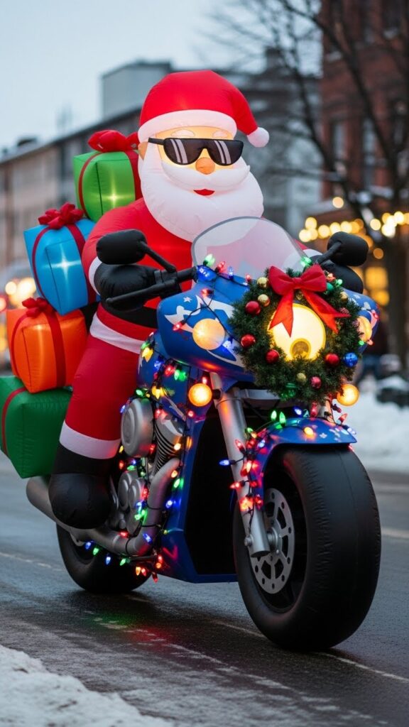 Modern takes on Santa feature him riding motorcycles, sports cars, or other contemporary vehicles that update the classic sleigh tradition. These fun inflatables show Santa embracing modern transportation while maintaining his festive mission—the motorcycle or vehicle is typically decorated with Christmas lights, wreaths, and a cargo of presents. Santa might wear sunglasses or other modern accessories that give him a cool, relatable personality. These designs appeal to motorcycle enthusiasts, car lovers, and families who enjoy mixing tradition with contemporary humor and style.