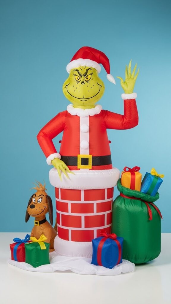 The Grinch has become a beloved Christmas icon, and inflatables featuring this grumpy-turned-generous character bring humor and pop culture appeal to holiday displays. These designs typically show the Grinch in his Santa disguise, perhaps emerging from a chimney with his bag of stolen presents or riding his overloaded sleigh with faithful Max. The character’s distinctive green coloring and mischievous expression make these inflatables instantly recognizable to Dr. Seuss fans. Many versions include details from the classic story—Mount Crumpit, Whoville elements, or the Grinch’s famous small heart growing three sizes.
