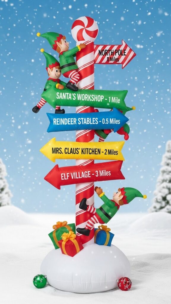 North Pole sign inflatables add playful wayfinding elements that enhance the storytelling aspect of holiday displays. These charming decorations feature classic wooden signposts with multiple directional arrows pointing to magical Christmas locations—Santa’s Workshop, Reindeer Stables, Mrs. Claus’s Kitchen, or indicating miles to the North Pole. Candy cane striping, snow-capped details, and often included elf characters create dimension and personality. The signage concept allows for creativity and humor, with some versions including funny destinations or personalized family names as if your home itself is a notable North Pole location.